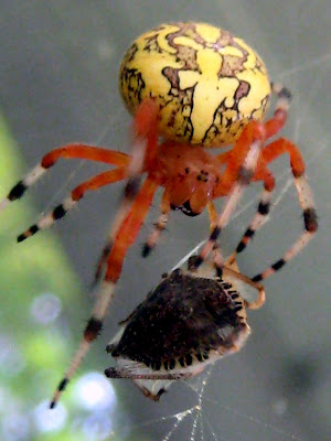 Today’s “hang in there” spider is a Marbled Orb Weaver, and this was a big one. I actually initially thought it was a yellow leaf. It was rough getting an in-focus shot, as it was busy wrapping up this stink bug.