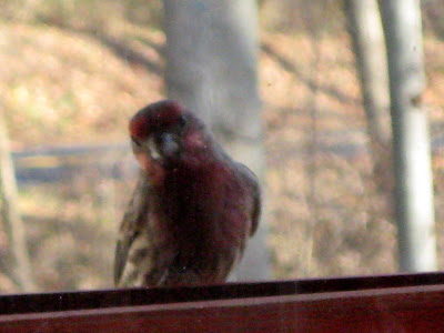 I’ve got a flock of house finches jockeying for position at the feeder. From where I sit I count six physically in the feeder, two on the feeder, two on the bracket that holds the feeder, and another half dozen clinging to the window screens or just flying nearby waiting for some room.
