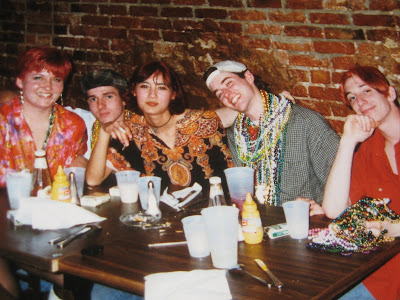 I do not love the pictures of me that have been taken there. At least at Mardi Gras. Yes, I was 18 and 19 at the time…. still, I think I’ll spare you. This was the only one I deemed not too humiliating. That’s me at center, Jeff at my right. Don’t ask me how he got all those beads.