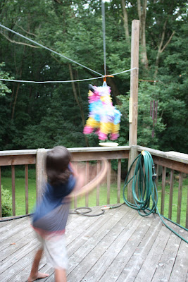 I can’t say I’ve ever really understood the allure of the pinata, the need to beat something with a stick to get at the goodies inside, but whatever. Kid wants a pinata (thank you, Jon & Kate, for letting her know that she NEEDED a pinata) and a pinata she had.