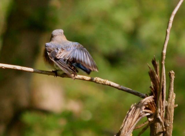 Yay! We have bluebirds! This is the female, I think; I have one other photo of a bird that is much more brilliantly blue, but not focused properly (grrr, stupid tree branches getting in my way).
